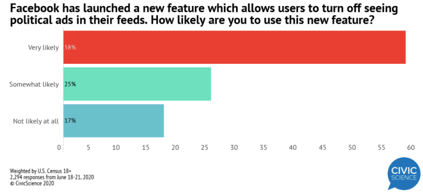 Critics blame Facebook for allowing political misinformation. Facebook is shifting the responsibility to the user: you can now turn political ads off on your Facebook feed. A survey of over 2,000 Facebook users found that 58% said they are very likely to turn off political ads.