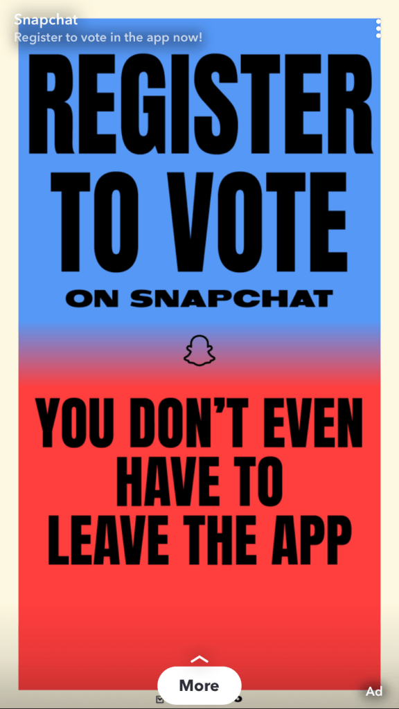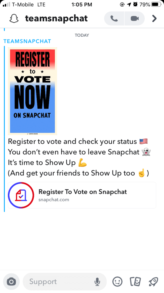 Everyone and their mother is promoting voter registration. Snapchat is running ads and even sending users a private message urging them to register. Additionally, Instagram and Facebook have voting information centers. When users open these apps a message pops up with information on how to register to vote.