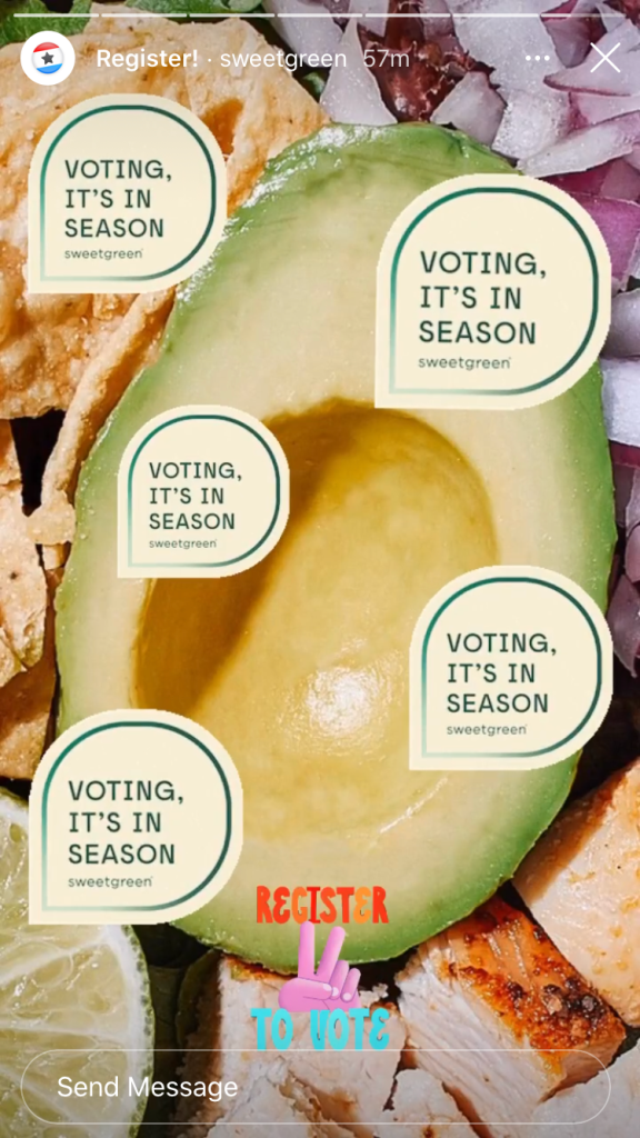 Check out this Instagram story feature that highlights accounts you follow who use trending stickers. This one here is called “Register!” and includes stories from people who use the “Register to Vote” sticker. Takeaway: Use trending Instagram stickers as another way to get your content in front of your followers.