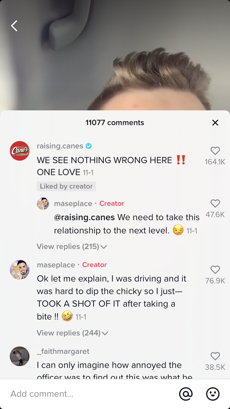 Reaching your audience on social is becoming easier thanks to TikTok. Brands like Raising Cane’s are winning it on TikTok by simply commenting on fan’s videos. For example, TikTok user @maseplace, Mason Glasco, posted a video about how he got pulled over while driving because an anonymous caller claimed he was taking “jello shots.” In the video, Glasco explains that the “jello shots” were mistaken for Raising Cane’s signature sauce. Raising Cane’s jumped at the opportunity to engage and commented, “WE SEE NOTHING WRONG HERE !! ONE LOVE.” The comment now has over 164K likes. Just by simply commenting, Raising Cane’s was able to gain exposure and engagement with its audience (thanks to the FYP algorithm) without even posting a video. Everyday brands can get just as good engagement from posting comments as posting videos. Takeaway: Comment on relevant TikTok videos to gain exposure, engagement, and reach more users.